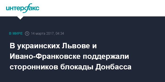 Москва. 14 марта. INTERFAX.RU - Львовские и ивано-франковские активисты поддержали требования отпустить задержанных участников блокады торговли с неподконтрольными Киеву территориями Донбасса, озвученные ранее в других городах Западной Украины, сообщили в штабе блокады торговли.