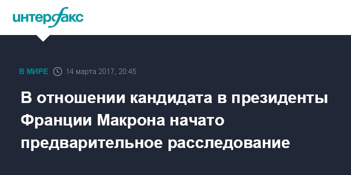 Москва. 14 марта. INTERFAX.RU - Парижская прокуратура объявила о начале предварительного расследования, связанного с деятельностью кандидата в президенты Франции Эммануэля Макрона, сообщает радиостанция Europe 1.