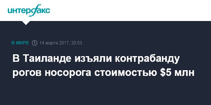 Москва. 14 марта. INTERFAX.RU - Таможенная служба в аэропорту Бангкока перехватила контрабандную партию рогов носорога общей стоимостью примерно $5 млн, сообщает во вторник британская телерадиокорпорация "Би-би-си".