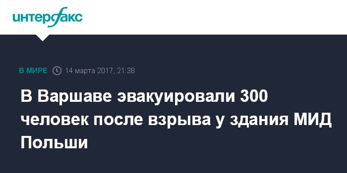 Москва. 14 марта. INTERFAX.RU - Не менее 300 человек эвакуировали из министерства иностранных дел Польши в Варшаве после того, как возле здания прогремел взрыв, сообщает во вторник газета Gazeta Wyborcza.