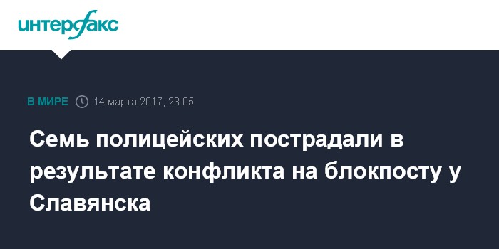 Москва. 14 марта. INTERFAX.RU - Семеро сотрудников украинской полиции были травмированы в результате конфликта с группой вооруженных граждан на блокпосту около города Славянск, сообщил во вторник начальник Главного управления Нацполиции в Донецкой области Вячеслав Аброськин на своей странице в фейсбуке. По его словам, пострадавшие госпитализированы.