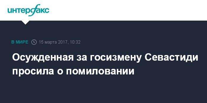 Президент РФ Владимир Путин 7 марта, руководствуясь принципами гуманности, подписал указ о помиловании Севастиди. Утром 12 марта она покинула стены СИЗО "Лефортово".
