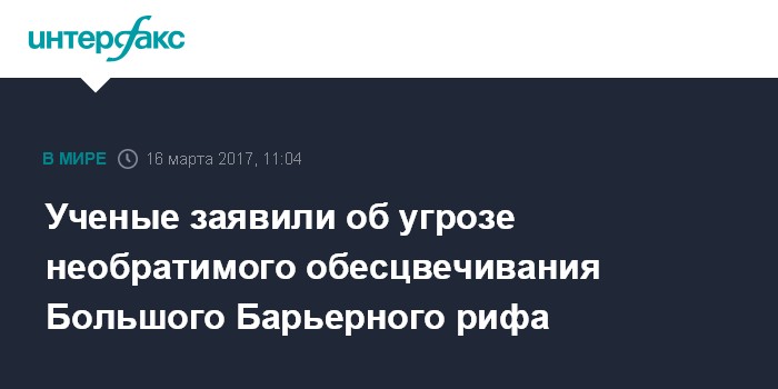 Москва. 16 марта. INTERFAX.RU - Большой Барьерный риф в Австралии может никогда не восстановиться после обесцвечивания, вызванного массовым вымиранием кораллов из-за глобального потепления, заявили австралийские ученые.