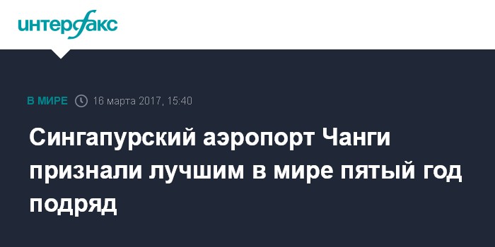 Москва. 16 марта. INTERFAX.RU - Сингапурский международный аэропорт Чанги в 2017 году пятый год подряд возглавил мировой рейтинг World Airport Awards, который британская маркетинговая компания Skytrax составляет на основе отзывов пассажиров.