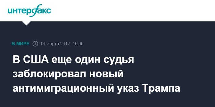 Москва. 16 марта. INTERFAX.RU - Федеральный судья в американском штате Мэриленд заблокировал новый указ президента США Дональда Трампа, временно запрещающий въезд в страну гражданам шести мусульманских стран, сообщил в четверг американский телеканал CNN.