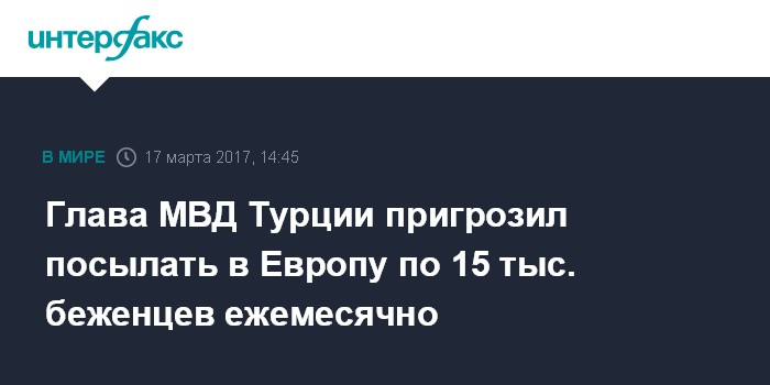 Москва. 17 марта. INTERFAX.RU - Турция готова каждый месяц отправлять в Европу по 15 тыс. беженцев, если ЕС продолжит недружественную политику в отношении Анкары, заявил глава турецкого МВД Сулейман Сойлу.