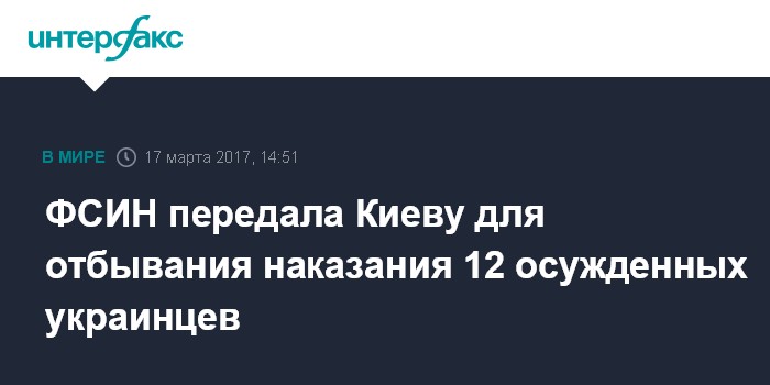 Москва. 17 марта. INTERFAX.RU - Федеральная служба исполнения наказаний (ФСИН) выдала Украине 12 граждан этой страны, осужденных в РФ, сообщили в пресс-бюро ведомства.