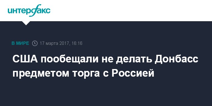 Москва. 17 марта. INTERFAX.RU - Министр иностранных дел Украины Павел Климкин в ходе визита в США получил заверения, что Крым и Донбасс не станут предметом торга Вашингтона и Москвы и что санкции против России будут сохранены.