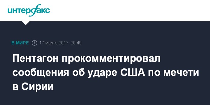 Москва. 17 марта. INTERFAX.RU - Авиация США нанесла удары не по мечети на севере Сирии, а по расположенному неподалеку зданию, в котором находились десятки боевиков террористической группировки "Аль-Каида", заявил в пятницу официальный представитель Пентагона США Джефф Дэвис.