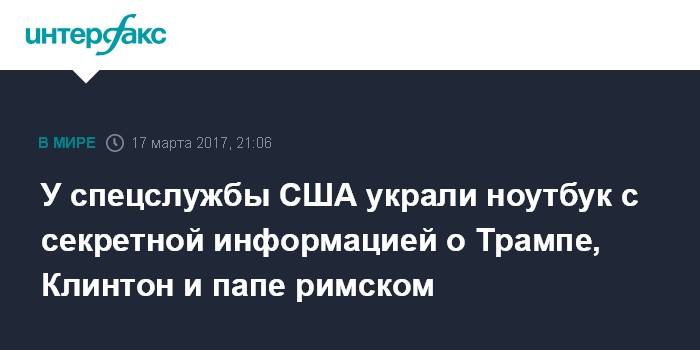 Москва. 17 марта. INTERFAX.RU - Ноутбук с секретной информацией, касающейся президента США Дональда Трампа, его бывшей соперницы на президентских выборах Хиллари Клинтон, а также папы римского Франциска украден в четверг из машины секретной службы, сообщает телеканал CBS.