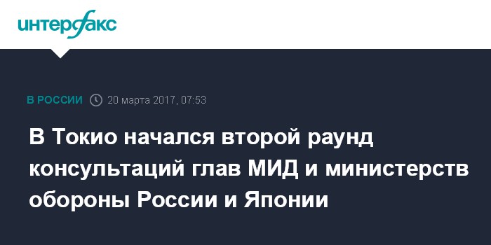 Москва. 20 марта. INTERFAX.RU - Второй раунд консультаций глав МИД и Минобороны РФ и Японии в формате "2+2" стартовал в Токио, передает корреспондент "Интерфакса".