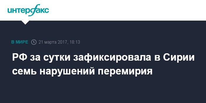 Москва. 21 марта. INTERFAX.RU - За прошедшие сутки Россия зафиксировала семь нарушений режима тишины в Сирии, Турция - 15, но РФ их не подтверждает, сообщили во вторник в российском Минобороны.
