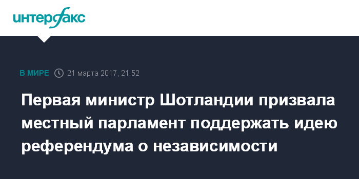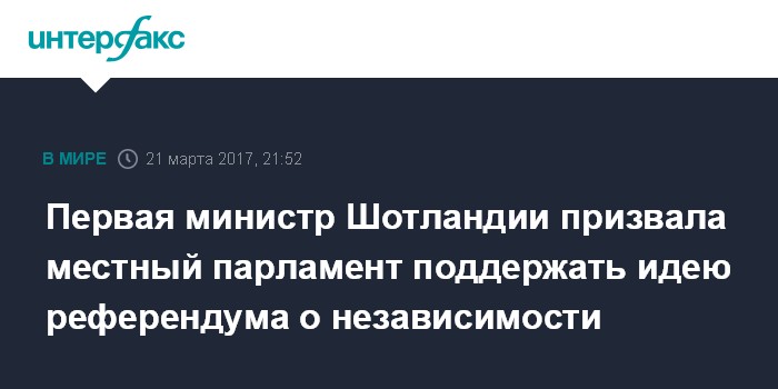 Москва. 21 марта. INTERFAX.RU - Первая министр Шотландии Никола Стерджен обратилась к шотландскому парламенту с призывом поддержать инициативу по проведению еще одного референдума о выходе этого региона из состава Соединенного Королевства, сообщило во вторник агентство Associated Press.
