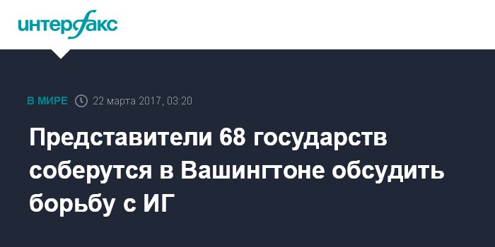 Москва. 22 марта. INTERFAX.RU - Министерская встреча стран-участниц возглавляемой США коалиции по борьбе с "Исламским государством" (ИГИЛ - террористическая организация, запрещенная в РФ), как ожидается, откроется 22 марта в Вашингтоне при участии представителей 68 государств.
