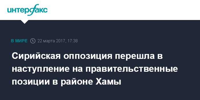 Москва. 22 марта. INTERFAX.RU - Отряды сирийской вооруженной оппозиции открыли в сирийской провинции Хама второй фронт, чтобы отвлечь на себя часть правительственных войск, атакующих в районах Джобар и Кабун близ Дамаска.