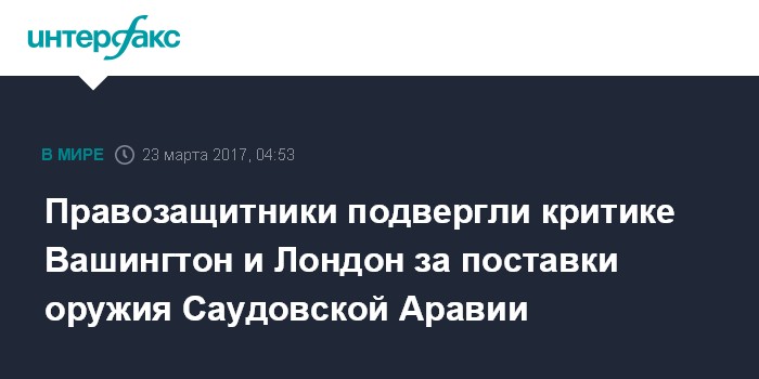 Москва. 23 марта. INTERFAX.RU - С обвинениями в адрес США и Великобритании за поставки оружия Саудовской Аравии, используемого против повстанцев в Йемене, выступила в четверг правозащитная организация Amnesty International.