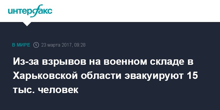 Москва. 23 марта. INTERFAX.RU - Из возможной зоны поражения близ военного склада в Балаклее Харьковской области Украины, где по состоянию на 8 утра по местному времени наблюдались взрывы разной интенсивности, эвакуируют 15 тыс. человек, сообщает пресс-служба Госслужбы Украины по чрезвычайным ситуациям.