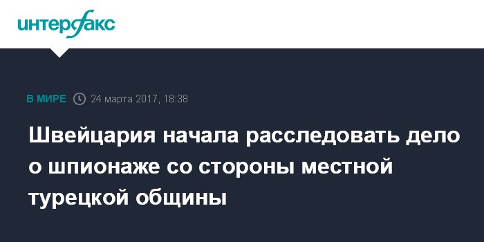 Москва. 24 марта. INTERFAX.RU - Швейцарский генеральный прокурор подтвердил факт расследования возможных случаев шпионажа, к которому могли иметь отношение представители местной турецкой общины. Об этом сообщил в пятницу швейцарский портал Swissinfo.