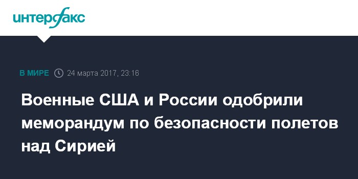 Москва. 24 марта. INTERFAX.RU - Представители министерств обороны США и России в ходе видеоконференции заявили о полезности меморандума о взаимопонимании по предотвращению инцидентов и обеспечению безопасности полетов в ходе операций в воздушном пространстве Сирии, сообщил официальный представитель Пентагона Джефф Дэвис.