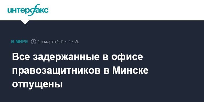 Москва. 25 марта. INTERFAX.RU - Все люди, задержанные в субботу в минском офисе незарегистрированного правозащитного центра "Весна", отпущены из Первомайского РУВД столицы, сообщается на сайте центра.