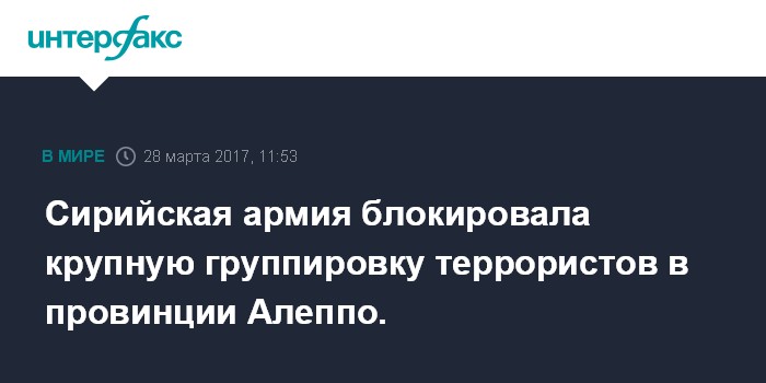 Москва. 28 марта. INTERFAX.RU - В Минобороны РФ заявляют, что сирийская армия блокировала крупную группировку террористов в провинции Алеппо.