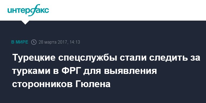 Москва. 28 марта. INTERFAX.RU - Национальная разведывательная организация Турции (MIT) следит за турками в Германии для выявления сторонников оппозиционного мусульманского богослова Фетхуллаха Гюлена, который в настоящий момент проживает на территории США. Об этом сообщает во вторник немецкая газета Süddeutsche Zeitung.