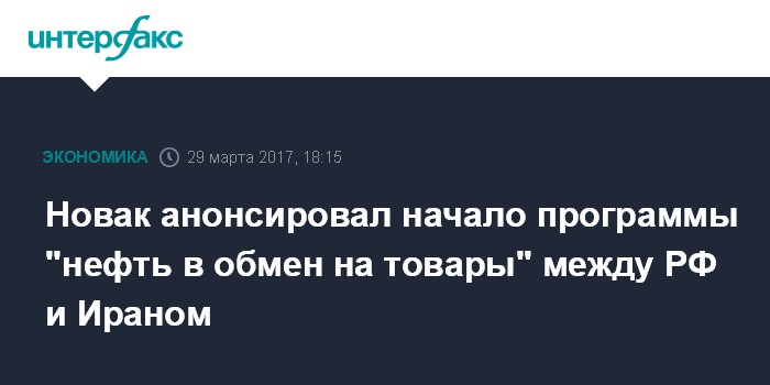 Москва. 29 марта. INTERFAX.RU - Программа "нефть в обмен на товары" между Россией и Ираном может заработать в 2017 году, сообщил журналистам министр энергетики РФ Александр Новак.