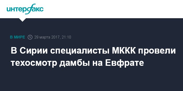 Москва. 29 марта. INTERFAX.RU - Группа инженеров и сотрудники Международного комитета Красного Креста (МККК) провели технический осмотр дамбы в городе Табка на Евфрате, неподалеку от которой располагаются позиции террористической группировки "Исламское государство" (запрещена в РФ), сообщает в среду агентство "Ассошиэйтед пресс".
