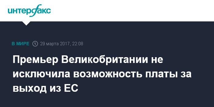 Москва. 29 марта. INTERFAX.RU - Премьер-министр Великобритании Тереза Мэй не исключила в среду, что Лондону придется перечислить в Брюссель "плату за выход" из Европейского союза.