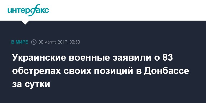Москва. 30 марта. INTERFAX.RU - Позиции украинских военных в Донбассе за прошедшие сутки были обстреляны 83 раза, в результате погибли два военнослужащих, трое получили ранения, сообщает в четверг пресс-центр штаба силовой операции.