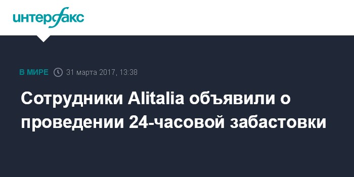 Москва. 31 марта. INTERFAX.RU - Основные профсоюзы крупнейшей итальянской авиакомпании Alitalia объявили о проведении 24-часовой забастовки, которая начнется в полночь 5 апреля по местному времени, сообщает газета Il Post.