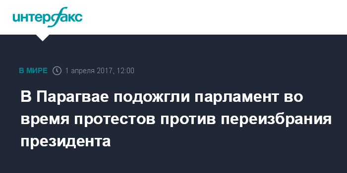 Москва. 1 апреля. INTERFAX.RU - В Парагвае вспыхнули ожесточенные протесты после того, как стало известно, что в верхней палате парламента (сенате) в секретном порядке проголосовали за конституционную поправку, позволяющую президенту страны переизбираться, сообщают в субботу западные СМИ.