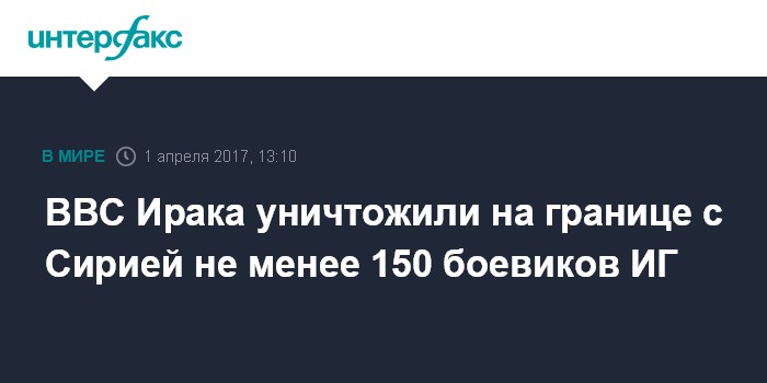 Москва. 1 апреля. INTERFAX.RU - По меньшей мере, 150 боевиков террористической группировки "Исламское государство" (ИГ, запрещена в РФ) были ликвидированы вблизи границы с Сирией в результате ударов ВВС Ирака, сообщает агентство Associated Press со ссылкой на заявление иракского командования.