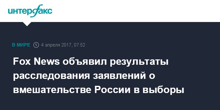 Москва. 4 апреля. INTERFAX.RU - Проведенное американским телеканалом Fox News расследование обвинений в адрес России в том, что ее деятельность препятствовала победе на президентских выборах Хиллари Клинтон, не выявило каких-либо свидетельств, дающих основание для таких утверждений, сообщил Fox News.