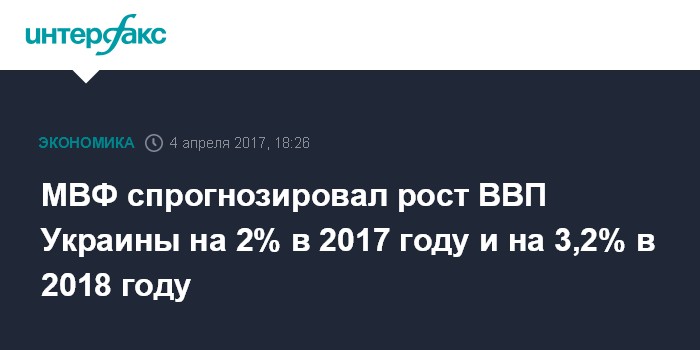 Москва. 4 апреля. INTERFAX.RU - Международный валютный фонд (МВФ) в связи с блокадой неконтролируемых территорий (НКТ) и потерей контроля над расположенными там предприятиями ухудшил прогноз роста валового внутреннего продукта Украины в 2017 году с 2,9% до 2%, чуть улучшив его на 2018 год - с 3% до 3,1%.