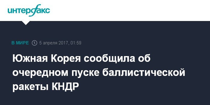 Москва. 5 апреля. INTERFAX.RU - КНДР запустила в сторону Японского моря очередную баллистическую ракету, сообщает в среду южнокорейское информагентство "Ренхап" со ссылкой на Объединенный комитет начальников штабов в Сеуле.
