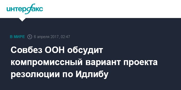 Москва. 6 апреля. INTERFAX.RU - Члены Совета Безопасности обсудят в четверг компромиссный проект резолюции по инциденту с химоружием в сирийском Идлибе, подготовленный на основе российского и западного проектов, сообщил "Интерфаксу" источник в штаб-квартире Всемирной организации.