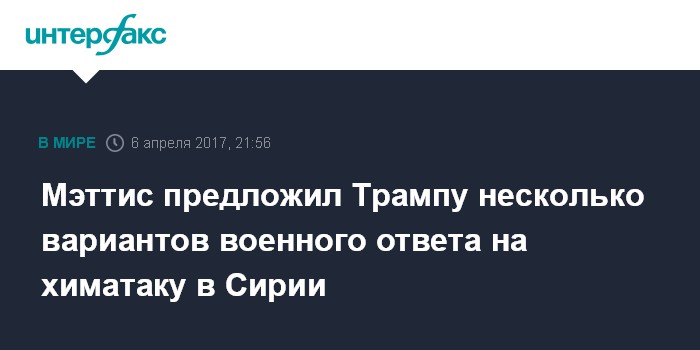 Москва. 6 апреля. INTERFAX.RU - Глава Пентагона Джеймс Мэттис представляет на рассмотрение президента США Дональда Трампа различные возможные варианты военного ответа на предполагаемую химическую атаку в Сирии. Об этом сообщают в четверг американские СМИ со ссылкой на неназванного представителя американской администрации.