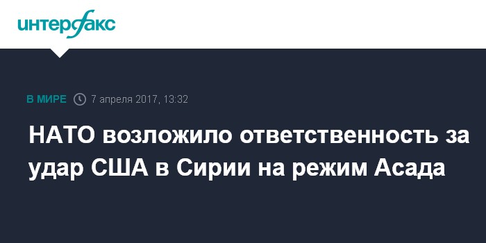 Москва. 7 апреля. INTERFAX.RU - Сирийский режим несет полную ответственность за развитие событий, вызвавших ракетные удары США по авиабазе "Шайрат" в Сирии, заявил в пятницу генеральный секретарь НАТО Йенс Столтенберг.