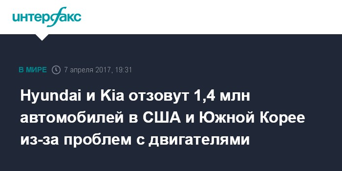 Москва. 7 апреля. INTERFAX.RU - Южнокорейские автопроизводители Hyundai Motor Co и Kia Motors Corp планируют отозвать более 1,4 млн автомобилей в США из-за дефекта двигателей.