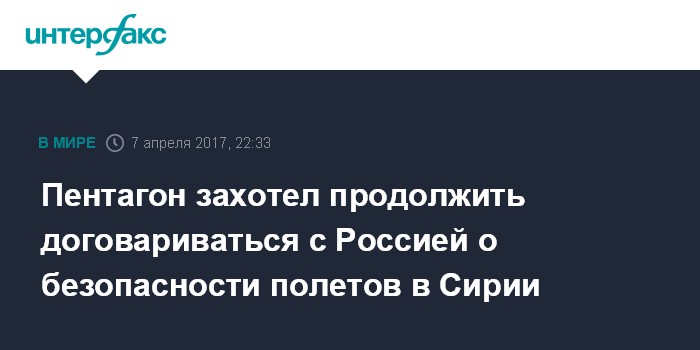 "Минобороны США рассчитывает продолжить диалог (с РФ - ИФ) через канал по обеспечению безопасности полетов", - сказала "Интерфаксу" пресс-секретарь американской дипмиссии Мария Олсон. "Все действующие в небе над Сирией стороны заинтересованы в избежании инцидентов и просчетов, и мы рассчитываем, что Минобороны РФ придет к аналогичному выводу",- отметила она. "Обсуждение механизмов по обеспечению безопасности полетов продолжается", - подчеркнула Олсон.