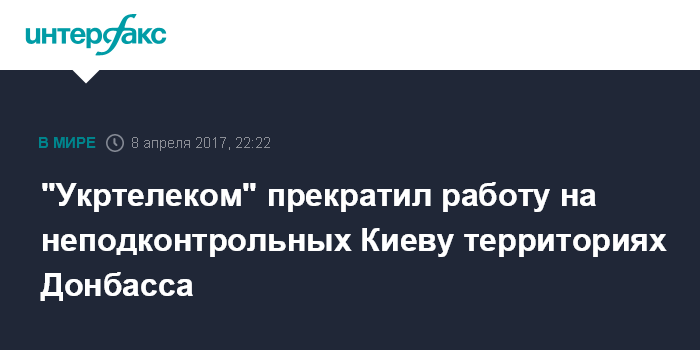 Москва. 8 апреля. INTERFAX.RU - ПАО "Укртелеком" впредь не будет предоставлять услуги на территориях самопровозглашенных Донецкой и Луганской республик, сообщает пресс-служба компании.