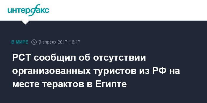 Москва. 9 апреля. INTERFAX.RU - Организованных российских туристов в местах терактов, совершенных в воскресенье в египетских городах Танта и Александрия, не было, сообщила порталу "Интерфакс-Туризм" пресс-секретарь Российского союза туриндустрии (РСТ) Ирина Тюрина.