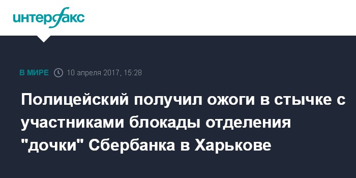 Москва. 10 апреля. INTERFAX.RU - В результате стычки, возникшей при оттеснении активистов радикальной партии "Национальный корпус" от отделения "дочки" Сбербанка в Харькове, пострадал полицейский, сообщила начальник отдела коммуникаций главного управления нацполиции Украины в Харьковской области Елена Баранник.