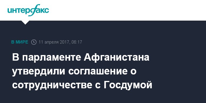 "Нижняя палата афганского парламента утвердила соглашение о сотрудничестве с Государственной думой РФ. На заседании присутствовал 121 член палаты, из которых документ поддержал 101 афганский парламентарий. Спикер парламента Абдул Рауф Ибрагими подчеркнул особую важность соглашения", - говорится в публикации.