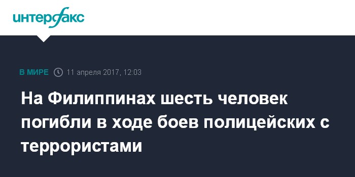 Москва. 11 апреля. INTERFAX.RU - По меньшей мере шесть человек погибли во время боев филиппинских полицейских с террористами группировки "Абу Сайяф" на острове Бохол, сообщает во вторник агентство Associated Press со ссылкой на главу полиции страны Рональда де ла Росу.