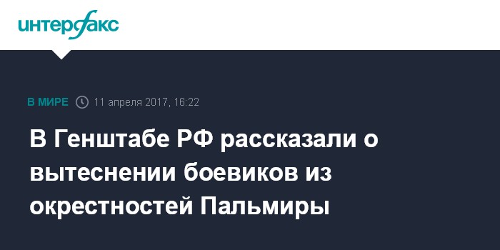 Москва. 11 апреля. INTERFAX.RU - Подразделения сирийской армии продолжают расширение зоны безопасности вокруг Пальмиры, сообщил начальник Главного оперативного управления Генштаба Вооруженных сил РФ генерал-полковник Сергей Рудской.