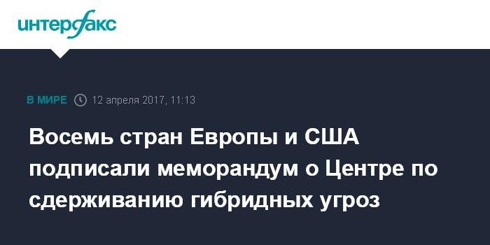 Москва. 12 апреля. INTERFAX.RU - Ряд стран НАТО и Европейского союза (ЕС) договорились об учреждении Европейского центра по сдерживанию гибридных угроз в Хельсинки.
