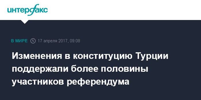 В ночь на понедельник Глава Центральной избирательной комиссии Турции Сади Гювен подтвердил, что большинство проголосовавших на референдуме высказались за изменение конституции, существенно расширяющее полномочия президента. Агентство Associated Press отметило, что ЦИК сделала это заявление почти сразу после того, как глава страны Реджеп Эрдоган поздравил сторонников с победой, хотя официальные результаты еще не были объявлены.