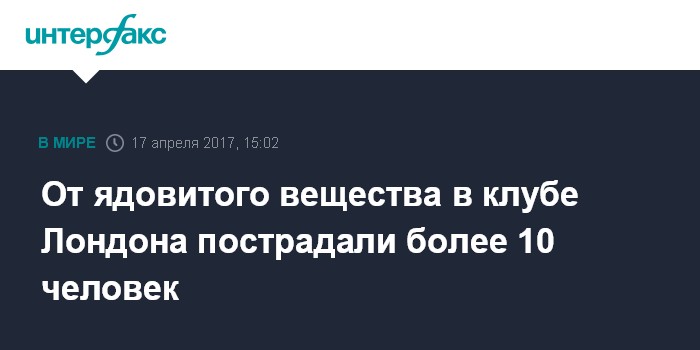 Москва. 17 апреля. INTERFAX.RU - По меньшей мере 12 человек пострадали в результате нападения с использованием ядовитых химических веществ в клубе на востоке британской столицы, сообщает в понедельник телерадиокорпорация "Би-би-си".